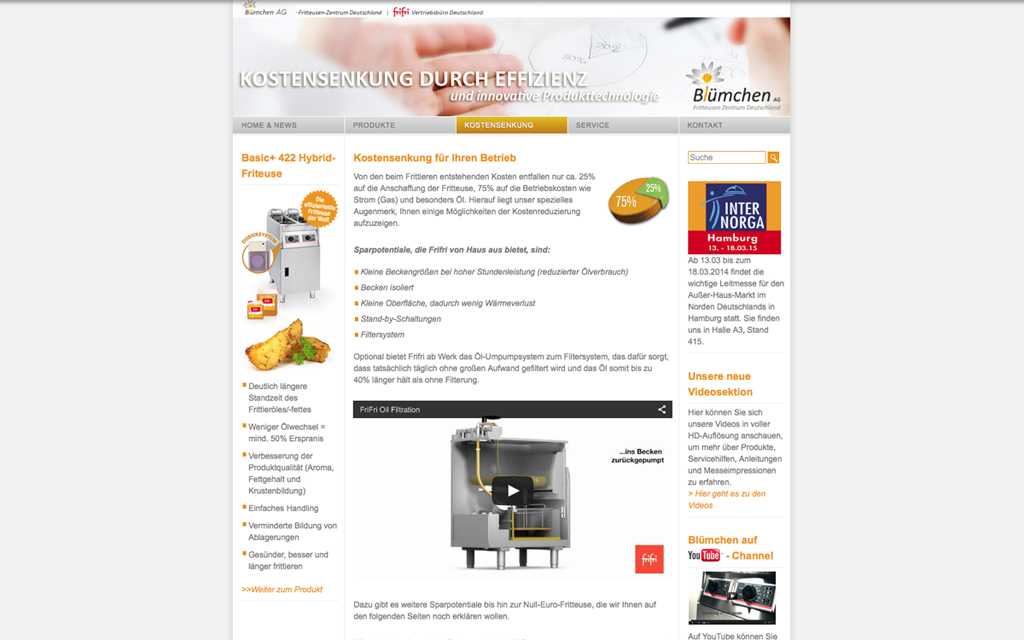 Im Rahmen eines Corporate Design Relaunches wurde die Website komplett neu konzipiert und Redesignt. Die Geschäftsbereiche INDUSTRIE, GASTRONOMIE und CONSUMER, die vorher nicht erkennbar getrennt waren, kamen im neuen Konzept voll zum tragen; dadurch wurden die Bereiche für die Zielgruppen besser vordefiniert und somit leichter auffindbar.